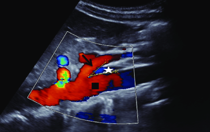 Se ha observado que los neonatos que desarrollan NEC tienden a tener una velocidad sistólica máxima y un índice de resistencia más altos en la SMA durante el primer día postnatal.[1] Además, el flujo diastólico en la SMA y el tronco celíaco normalmente debe ser anterógrado, y cualquier alteración en este flujo puede indicar problemas hemodinámicos significativos.[3-4]