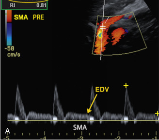 A) Las ondas Doppler espectrales de la arteria mesentérica superior (AMS ) en ayunas muestran un patrón de flujo de alta resistencia