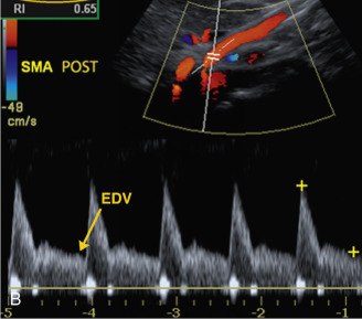 (B) La imagen Doppler espectral de la AMS en estado posprandial de este paciente muestra un aumento en el intervalo de la velocidad sistólica máxima (VSM ) y la VTD. Obsérvese el aumento de la VTD a 55 cm/s.